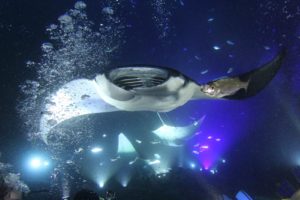 Imagine being submerged and sitting on the bottom of the ocean, about 30 feet (10 meters) deep, and looking towards the surface: you can see all the bubbles go up, lights shining towards the surface – manta rays dancing in between – and that absolutely feels like a rock concert.