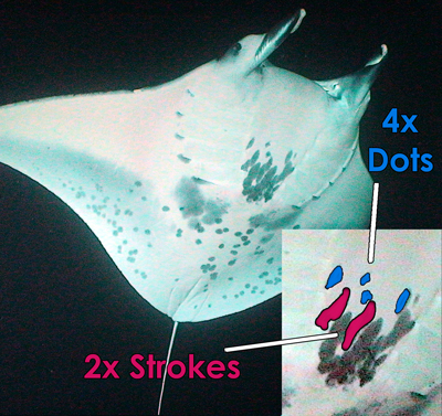 Boo-Boo Ray was identified on August 31, 2006 at Manta Village by Cynthia Hankins. She was a pup and approximately 4 feet wide but has grown to 8-9 feet.