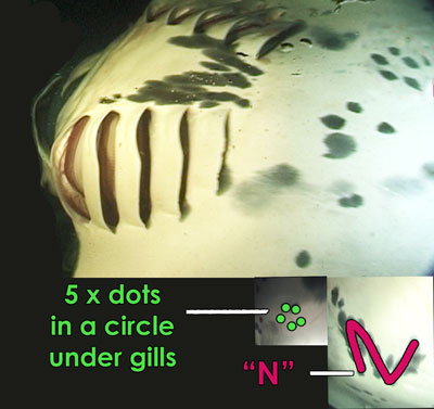 The markings on Cousteau have the shape of the letter "N". He also has a group of spots under his gills that resembles a small circle.