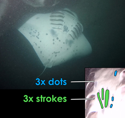 Elviki Ray has 3x dots on the right side and 3x strokes in the middle of her ventral side.