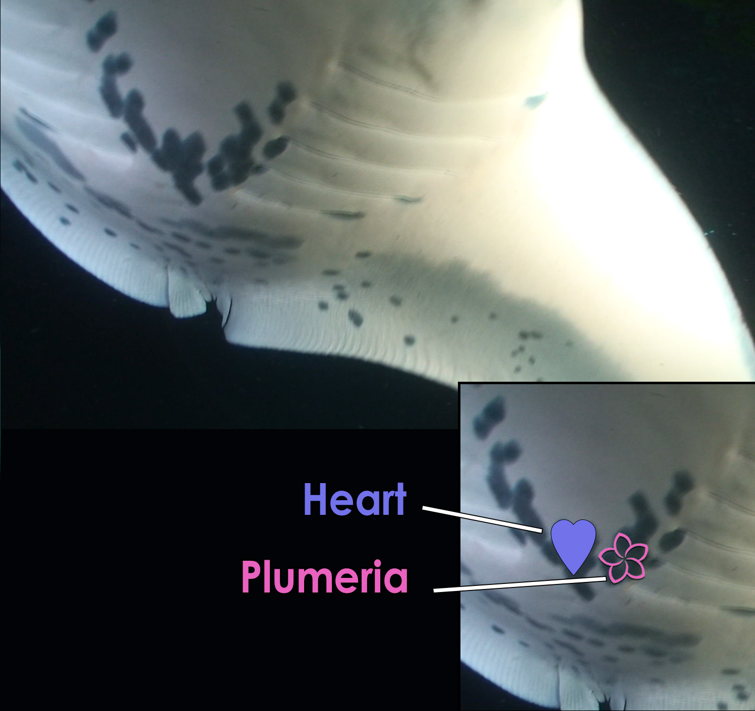 Ryan Leinback identified FinsUp on August 1st, 2014, at Garden Eel Cove. She then gifted the naming rights to fellow diver Joi Petrik, who chose the name “FinsUp” in honor of the expression often used by divers. While snorkeling with manta rays, snorkelers are often reminded to have their fins up to ensure they are not kicking the mantas as they may come within inches of you. The name is a reminder to protect these magnificent creatures every day.