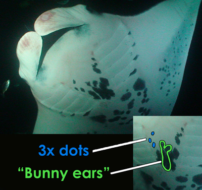 Isabel was identified on October 15, 2001 at Manta Heaven. She is a mature female and 12-14 feet wide.