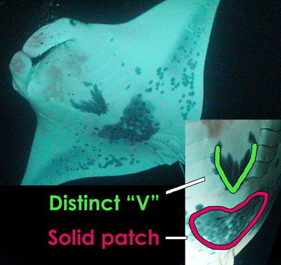 Jay Ray was identified on September 5, 2007 by Martina Wing at Manta Heaven. We see him most often when the plankton is abundant.