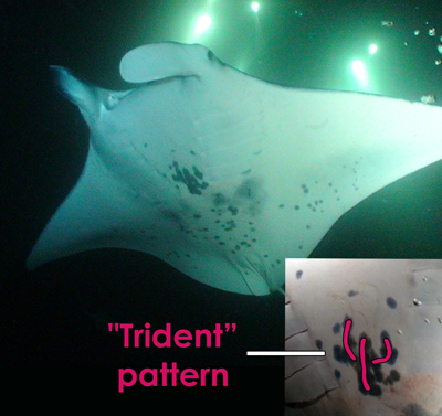 She has had to deal with many fishing hooks and scrapes since being identified, however she is a resilient manta ray. During the first few months she was shy, stayed mostly outside the lights and close to the bottom. It took her about 3 months to become trusting to the lights. She has been a regular and often the ”star” of the Manta Village show.