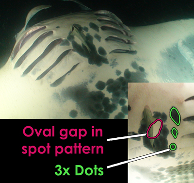 Kapono Ray was first identified on May 4, 2001 at Manta Heaven. His wingspan is about 8-10 feet.