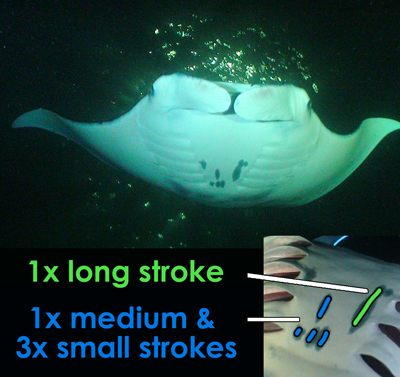 Melainah Ray was a young manta when she started to feed at the lights. She, like most new mantas we have encountered, was wary of the bubbles, sounds, and movements of the divers and snorkelers.