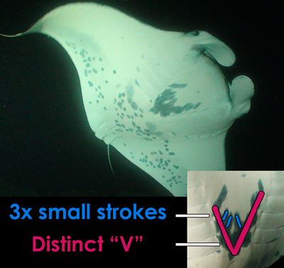 Ralph’s Ray was identified on October 22, 2011, at Manta Village by Ryan Leinbach. He was a pup measuring with a 4-foot wingspan. Today he is very comfortable and not afraid of bubbles and too much activity.