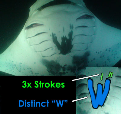 W Ray is a large female about 14′ across and belongs to the incredible group of manta rays that were identified by Steve Myklebust in 1979, just like Lefty!