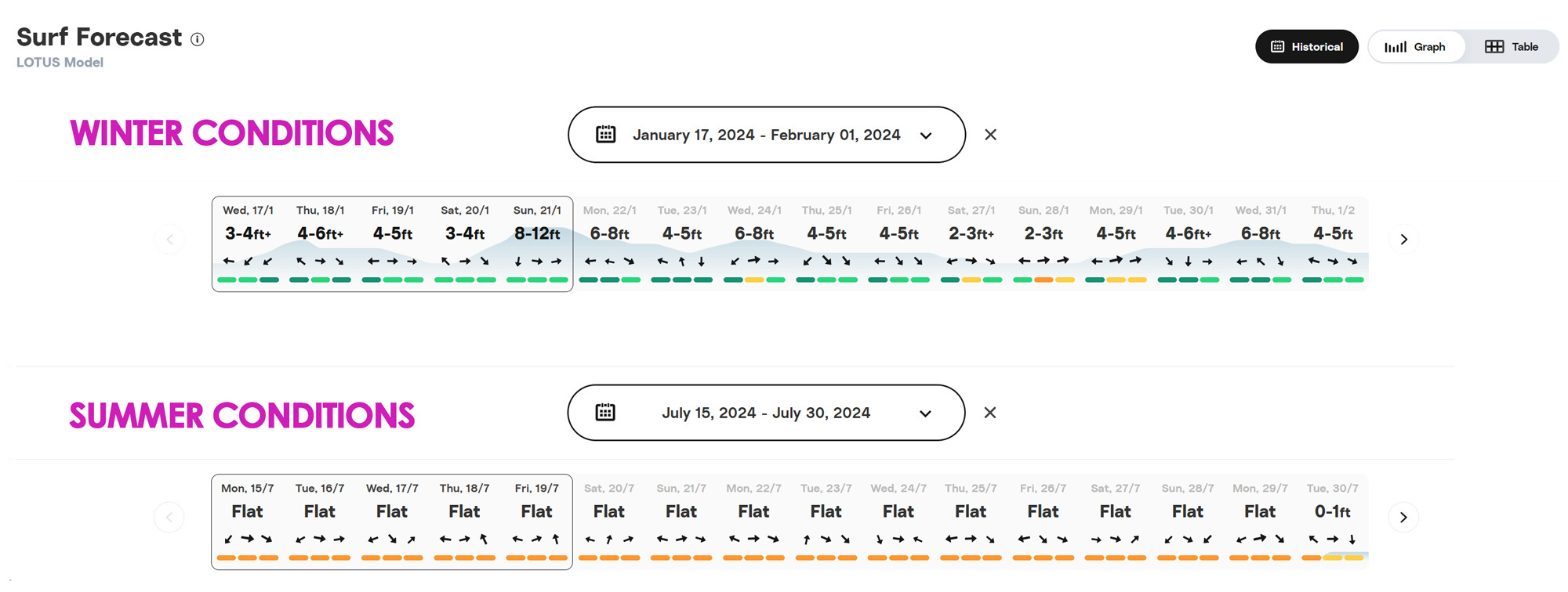 The example below shows an ocean forecast from last winter for the bay we operate from, versus the summer months.